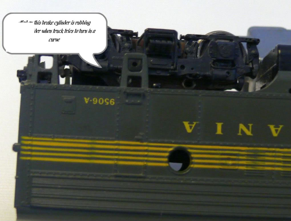 I dropped an old PRR F7A shell on to a powered chassis I pulled out of the back of a draw & was surprised to find that at the 1st curve it kept going straight off the rails. Closer inspection revealed that the front & innermost rear side ladders on the shell were fouling brake cylinders on the trucks. The old chassis that I took the PRR shell off does not have molded brake cylinders on the trucks.