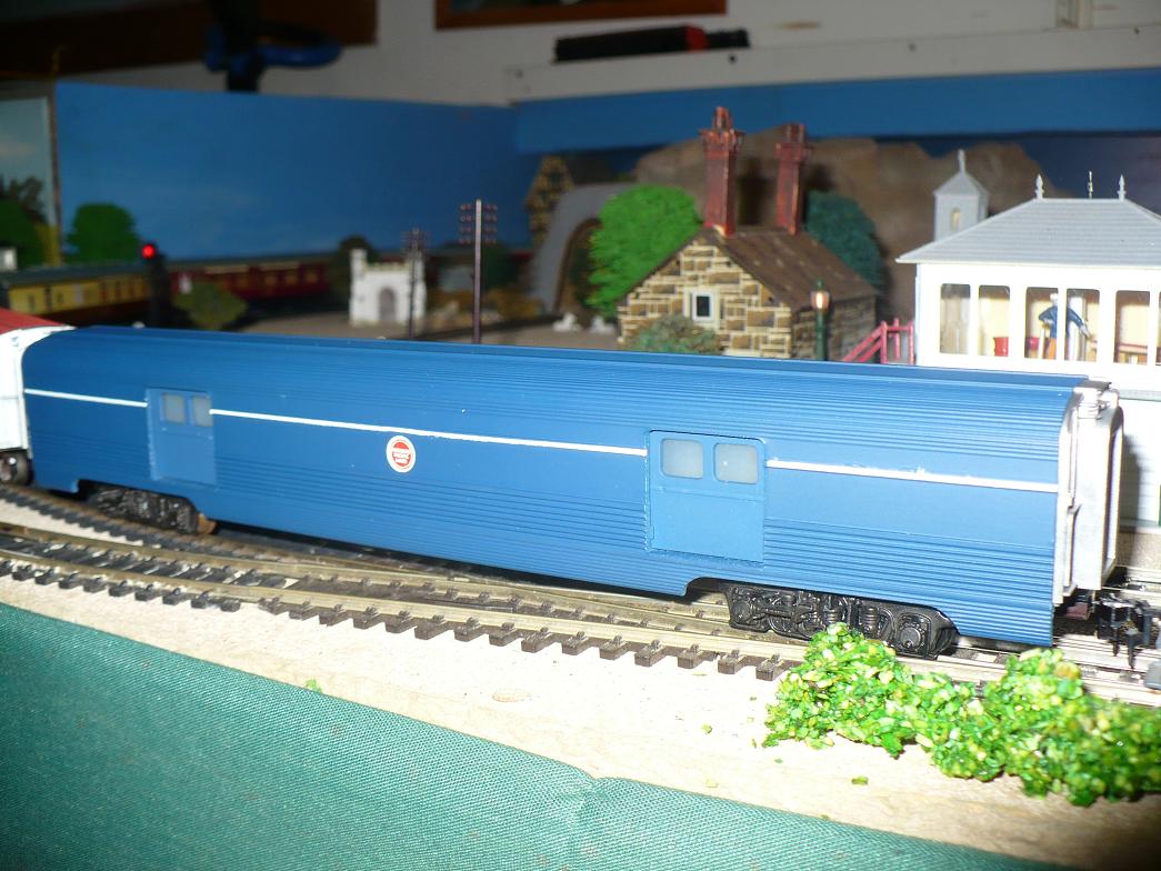 Hello All-- Having just obtained a few TycoKit aluminum undecorated baggage cars (same as Mantua's, but sold as TycoKit), I decided to paint one in one of my favorite looks--It's Missouri Pacific's simplified scheme, late 60's-early 70's just before Amtrak. It's very simple but quite striking, I think. The pic could be better, but basically just blue with white stripe and Mopac herald in the center (Striping and herald are decals from a Mopac diesel set).