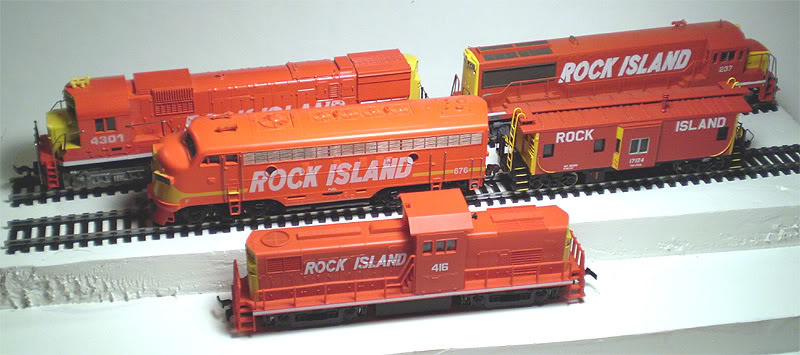 The color comparison isn't easy due to my lighting on this group, but here's the MRC Rock Island F-7 sitting with a TYCO C430; Stewart Executive U25B; Athearn RTR Bay Window Caboose; and IHC C415. If you were standing there, you'd have noticed that the Stewart-Athearn-and even IHC models all had a similar red...but the poor MRC is over with the TYCO C430 in the somewhat curious looking hue red category.
