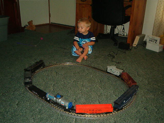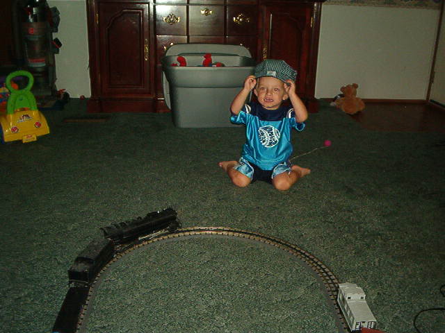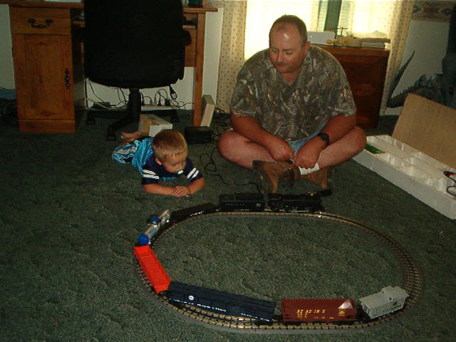 we took these pictures today & i just had to post a couple of them. this is me & my grandson Haydn. he's almost two. he was getting a little board, so i broke out a Lionel train set & set up a little circle of track. it kept him busy for about an hour before he had to take a nap. i worry about him all the time because of the piece of crap his momma's living with. he'a an abusive punk. they live about 100 miles away, so it's hard to do anything about it when everything goes down. all i can say is he better never start on this little feller, they'll never find him if he does.