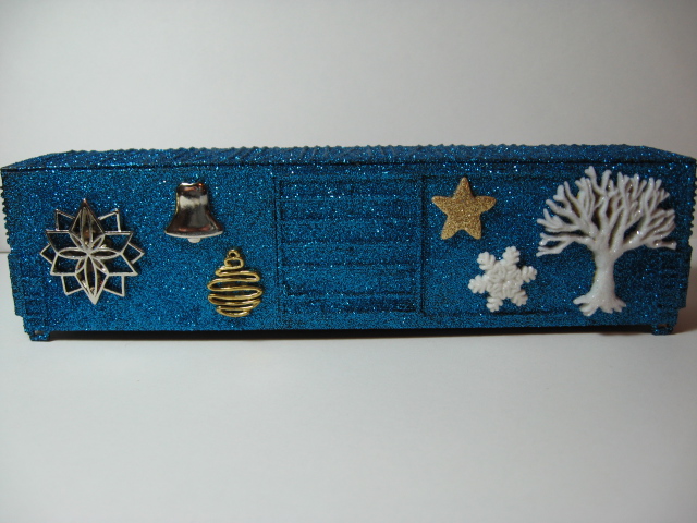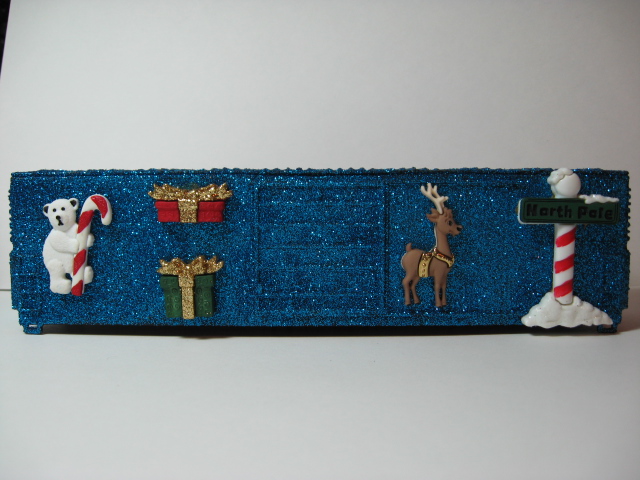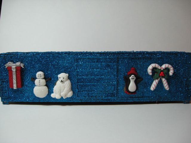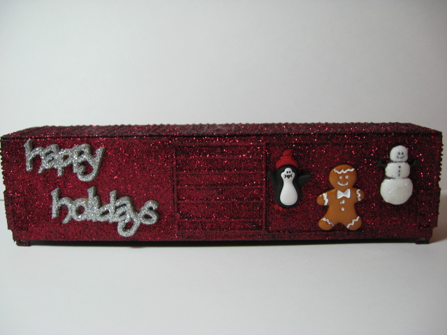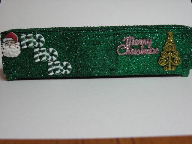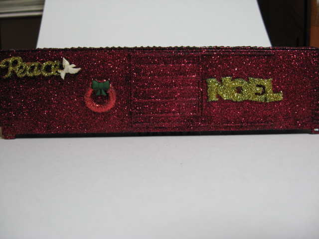 Still working on a few but here are pics of finished cars - wheel sets not installed yet. Red Glitter Happy Holidays car