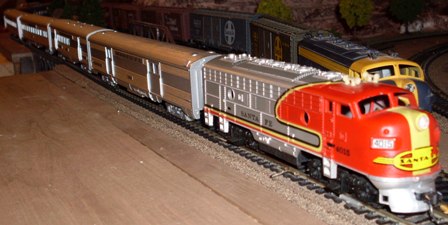 Last week someone mentioned Super Chief. Here's the Tyco pulling my Super Chief train of Athearn streamliners. I'll admit I usually use an Athearn super heavyweight for this, but the Tyco can handle it.