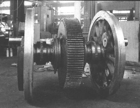 How those wheels are supposed to turn each other without slipping is a mystery. If the guy was really a respected engineer, you'd think he would have geared the upper sets of wheels to the drive wheels with teeth inboard of the flanges, like a pancake drive. Even that would have been a ridiculous arrangement, since you're gearing it up instead of down, increasing speed and reducing torque.