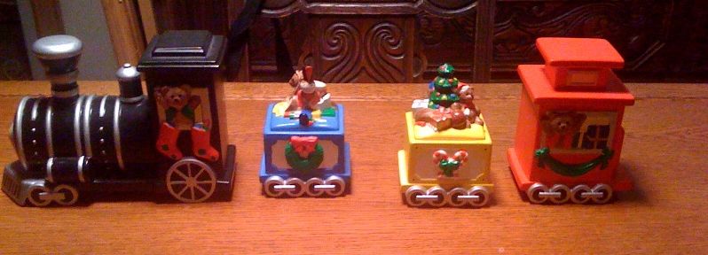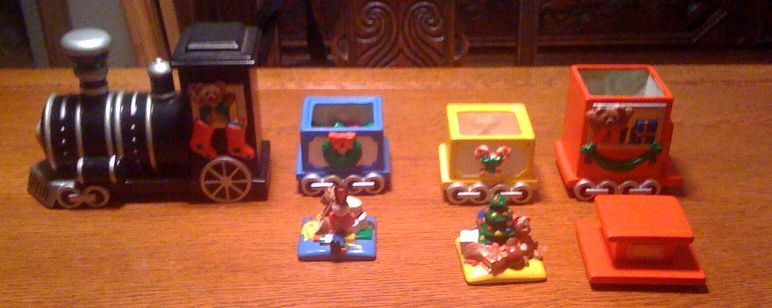 Second - this is my family's Christmas train. My mom hand-painted these ceramic locomotive, cars and caboose, fired them, and the cars are filled with M&Ms of the plain, peanut and almond varieties each year. Opened and closed. Totally my favorite Christmas train.
