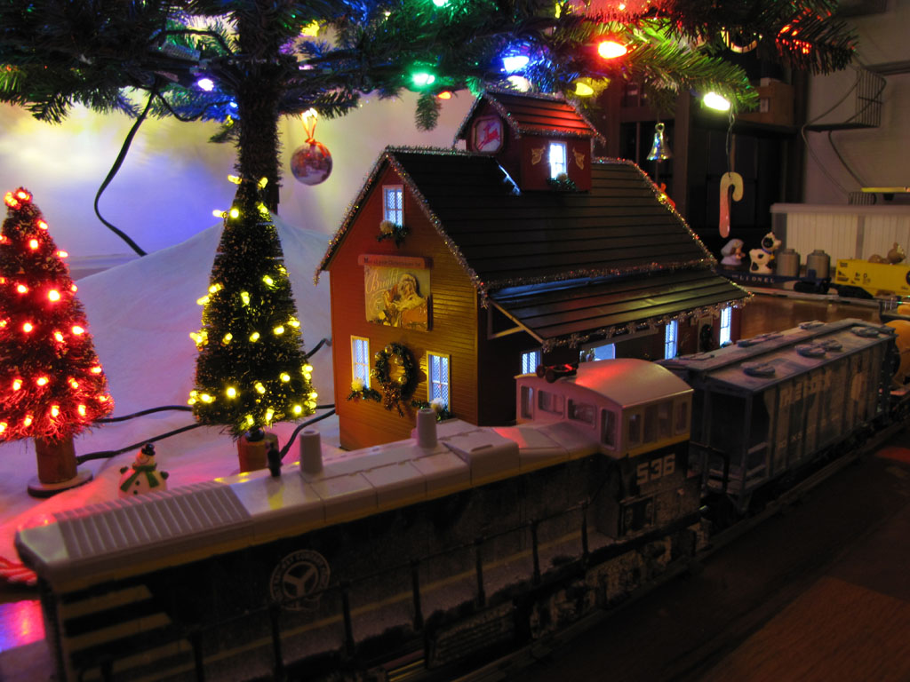 This year we added the building... a Plasticville feed mill we decorated, and I added some synchronized music/lights salvaged out of a sales display from GE / Lowe's. It's pretty awesome. I'd upload video, but don't have a .mov editor.
