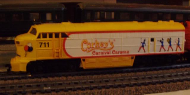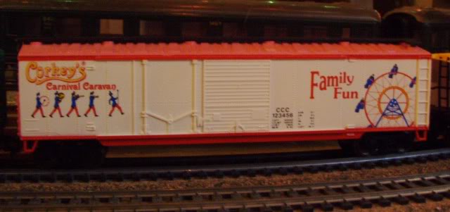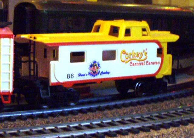 Put out by IHC in the early 90s, the basic set (#401 Corkey's Train) that I own came with no track or power pack. It included a 24" x 36" backdrop depicting a carnival and 6 clown figures...