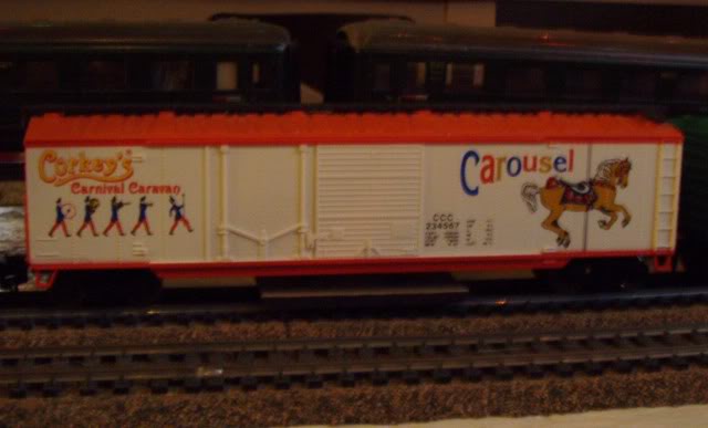 Set #400, Corkey's Flyer, included a Ferris Wheel kit, power pack and track oval. Set #410, Corkey's Carney, added to that a Ferris Wheel kit, Carousel kit and 3 concession stands. Set #420, King Corkey, added to that a large figure 8 of track, a Spider boxcar, Swinger and Sky Wheel kits, 9 more concession stands AND an operating crossing gate...whew...