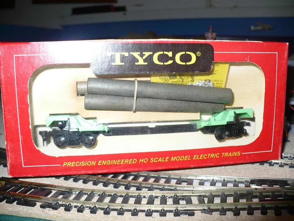 I just picked this up...I can't remember seeing one here before. It's a Tyco log transporter with a single 'spine' connecting the two truck ends, which are a lime green plastic. It comes with 3 logs and some metal chain to tie them down. Paid $6 for it unused in box, which I thought was fair.