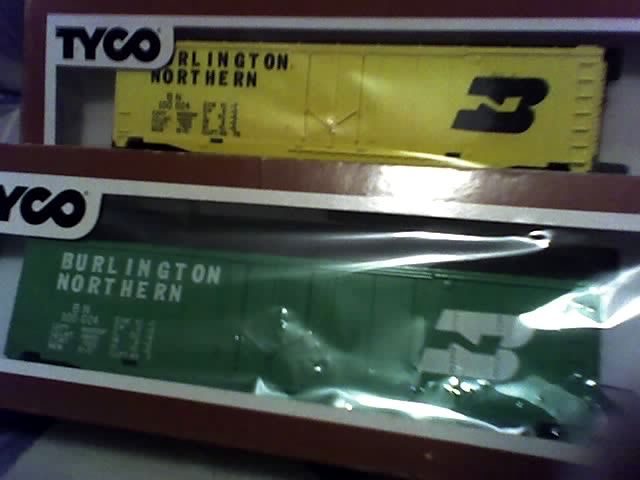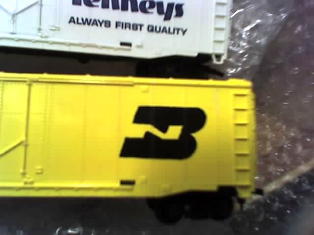 Here are some pictures of the yellow BN box car. Robert ( a.k.a. theoldreliable ) sold me this one from his personal collection. The boxed one I got from eBay for 4$ along with a BN caboose and the 4-bay open hopper.Both the yellow box and green has the same identical road numbers and load stencils.Sorry for the quality.