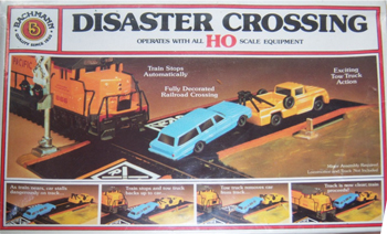 I have 2 of those new over the years and never could get the "under road mechanism" from the tow truck to slide into and connect to the stalled station wagon. Or worse yet, the mechanism would disengage with the car still hanging over the track and the locomotive would proceed to hit the vehicle anyway. Like most Bachmann track "hit-or-miss" (pardon the really bad pun) action accessories - this one I would have to say was probably a miss in 1982 when it first came out. My The Cattle Crossing accessory (also known as The Cowardly Cow and The Frantic Farmer), which Disaster Crossing is based on, works a heck of a lot better.