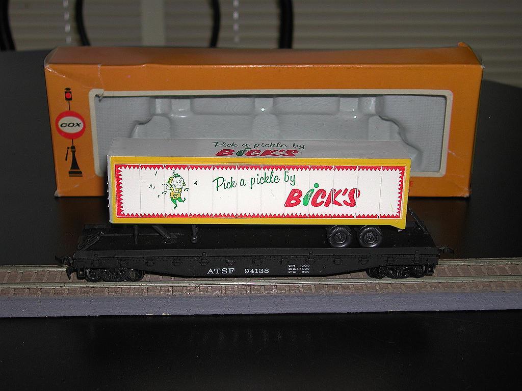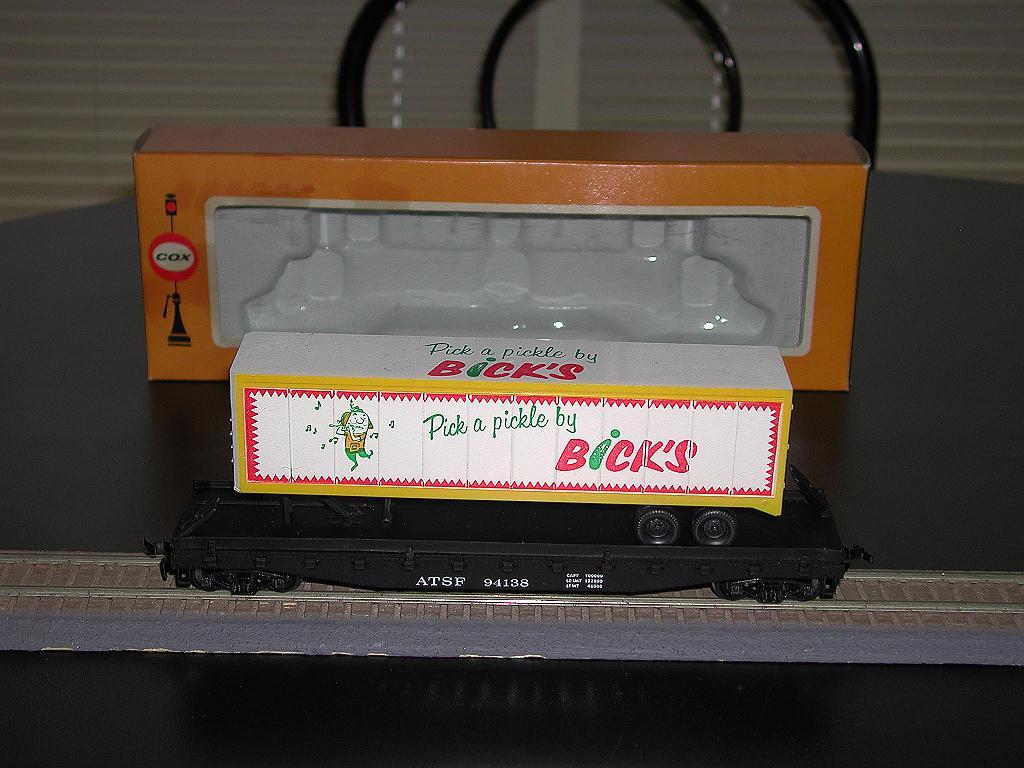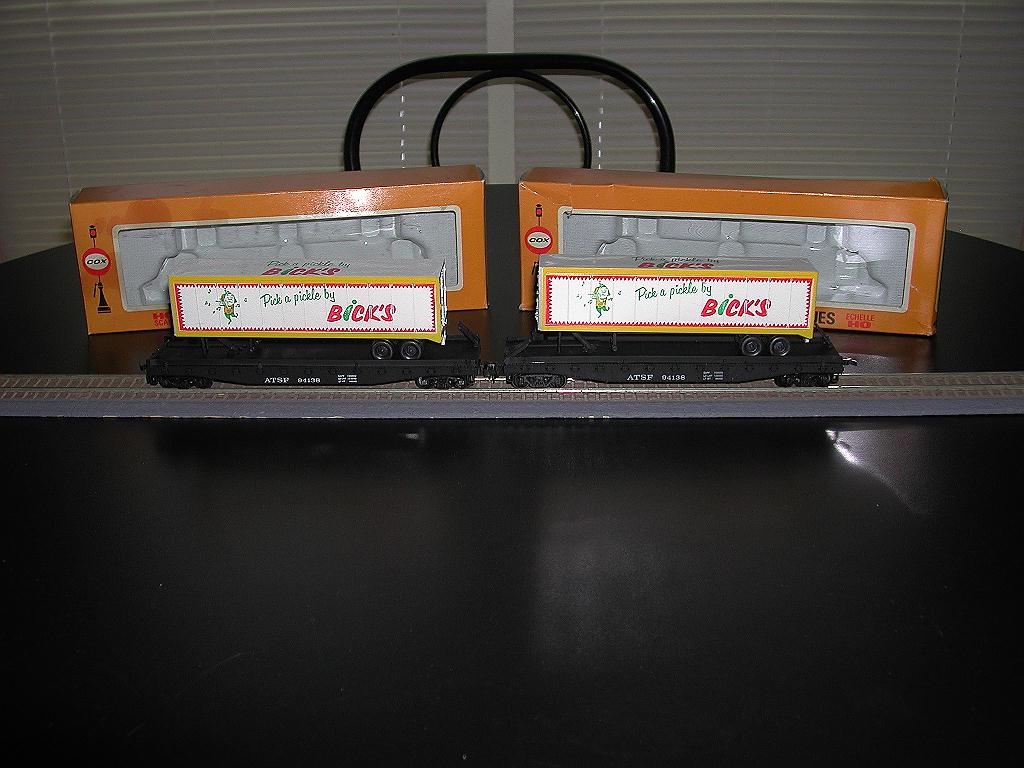 Years ago Ken Posted a Picture of the Cox Bick's Pickle Trailer Flatcar. Made in Canada for the Canadian Market. Hard to find and being that I liked the car, I had to have one. Over the years I looked and I would bid and be outbid at the last moment. No Luck.. Recently, I saw two cars for sale. I figured I would bid on the two and maybe I would get one. Well, I got them both. Here they are. Carl