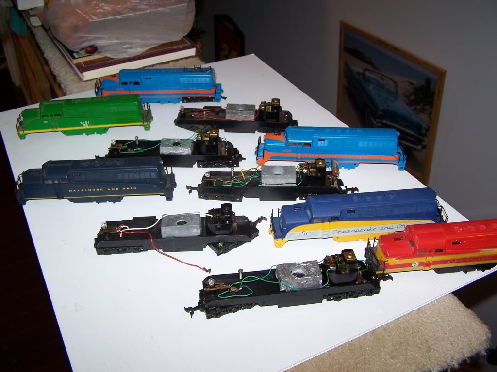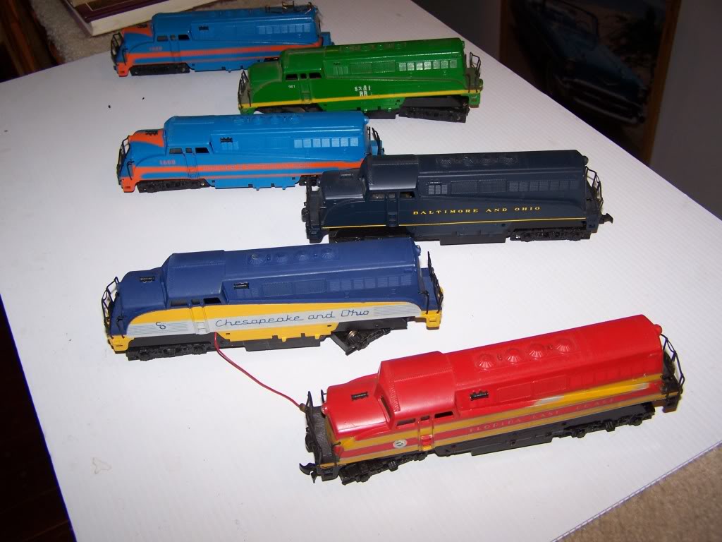 I haven't tried all of these, the FEC is the only one of these 5 I've tried, and it runs well. The rest I just pulled out of storage. I'll try them later on tonight. One, the C&O, has a busted wire off the motor, so I know IT won't go anywhere...wait, I can move it to another chassis,and then it will. LOL! I have a custom-painted BL-2 in the back, green and yellow, was an Ebay buy, not great graphics, but it was reasonably priced I think. The other custom is a B&O unit, dark blue, almost black, I thought it was the Western Maryland until after I looked at the pic, I wasnt' paying attention to them that closely. I have some CE&I units somewhere, another C&O ( Oh, i used that body for my Proto1000 unit ), and a Western Maryland. And an undecorated black shell from a P1000 unit. I know I have two Rock Island units, and one or two Monon's. I know I have them, but I can't find them right offhand. With all the organizing and rearranging I've done lately, I can hardly tell where I've seen them all. :) I'll have to get them all in one place this summer and take a pic of my Bl-2 fleet. A few years ago, a special BL-2 " GG1 " custom was sold on Ebay, I think it went for close to $90, someone had taken two front ends, cut off the back third, and plastic-welded them together. Looked neat, and I think they used the GG1 chassis for it. I had to stop around $55, at the time I was strapped for cash. I have two bodies I've already cut up to do one myself, as they were broken anyway in a jumble box at a show, so if I can get a nice GG1 chassis for a reasonable price, I'll try to convert one myself eventually.