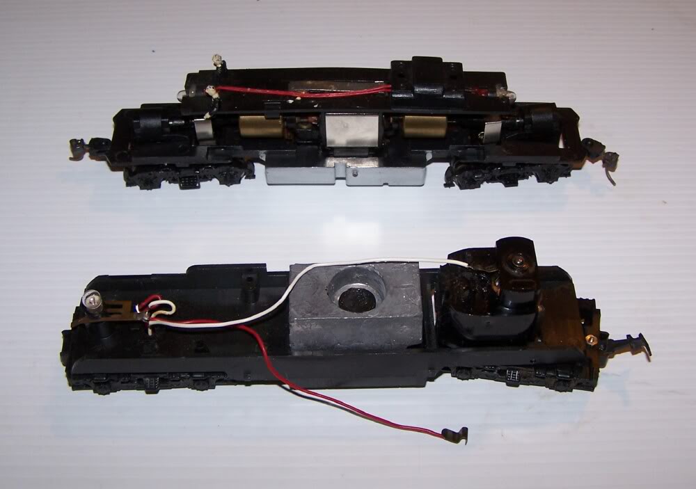 I may cut off a little more out of the centers, so the screens match up. Not sure yet, the fans on top will be an issue. I may just try to find an updated DCC chassis to mount it to, they cut up 2 Tempo chassis's, one has the 3-pole motor, so I really don't want to use that one anymore. I should just modernize it, probably with a Proto 2K unit. speaking of, here's a pic of both the older Tempo and the newer Walthers P2K chassis.