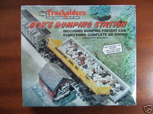 What I find really humorous is that obviously these box artists have no CLUE how real-world business operates. Take a look - trees growing up to the dump bin, there's no road access to it on the other side of the track, so HOW does it get used? Same with the log dumper, it's usually shown in the middle of a field ( how are they going to process wood there? Wouldn't there be a suburban or business area with log-holding facilities? ). While it makes for great <ahem!> art, it is just SOOOOOOOOO unrealistic in real life, I just have to smile every time I see one of these accessory boxes. I know kids won't know the difference, but still, you'd think they's spend a little more effort on a realistic setting for the accessories. I guess I'm too picky that way.
