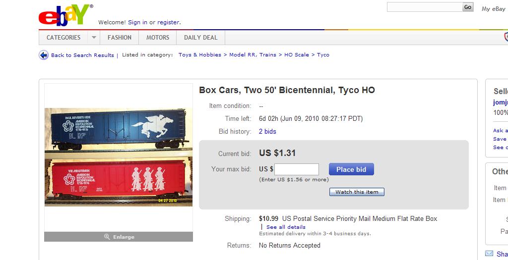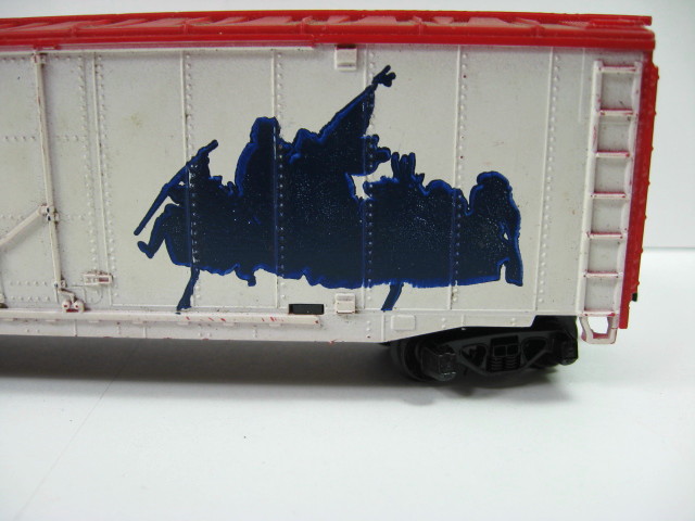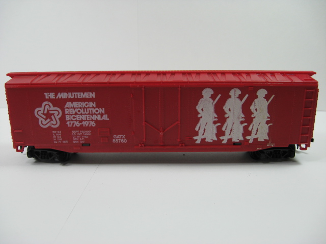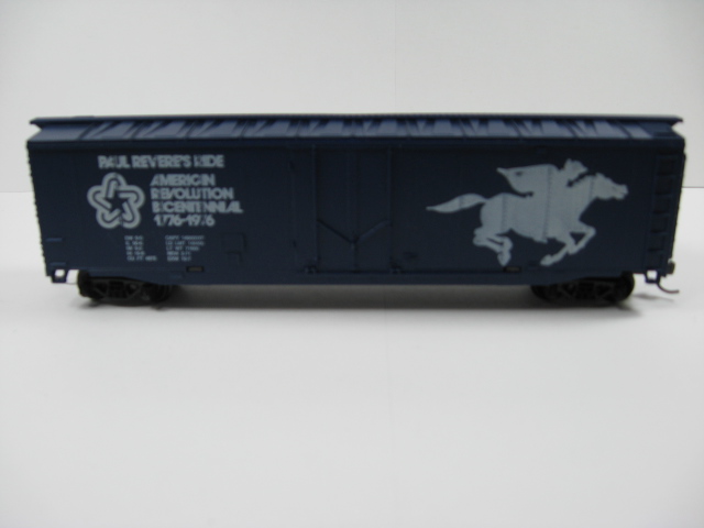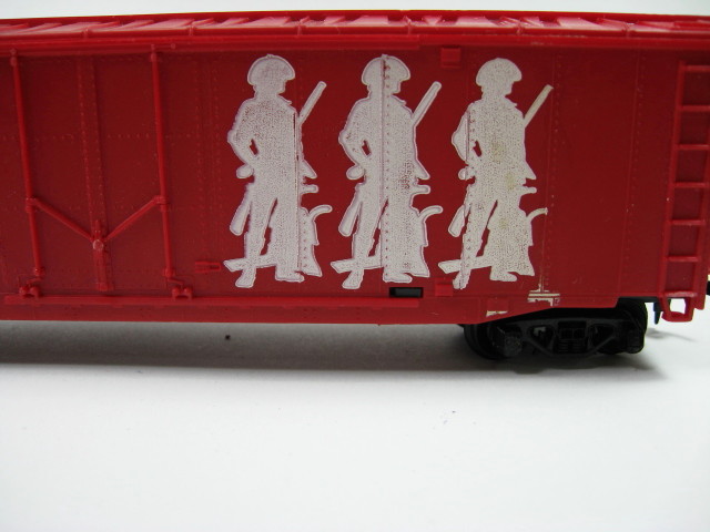 In 1973, Tyco not only released The Alco 430 Presidential lettered seal locomotives in Bi-Centennial colors - They released boxcars also. Pictured below is the First Issued commemorative boxcars in 1776. These were only issued for a short while as the cars contained graphics that weren't licensed by Tyco to use as the graphics were already in use elsewhere and owned by another company. The star logo and writing of American BiCentennial 1776-1976 on these 3 boxcars were the issue. I do not know name of company that owned this logo. The graphics on the red and dark blue boxcar were also said by some to contain in-appropiate images on the silhouette images of the men. The image was altered slighltly after these were brought to attention and you will see differences in images in a comparison later. These were released in 1973 and began with Number 362A-2.50 Minuteman BiCentennial boxcar - 2nd = Paul Revere's Ride DK Blue -Number 362B-2.50 and Washington's Crossing Number 362C-2.50