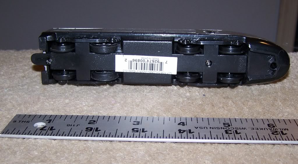 I like the looks of it, and haven't seen another HO model with that swoopy look as yet. Not inexpensivelly, anyway! Here's the underside :