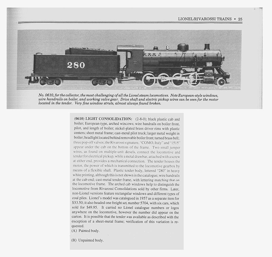 Hi Frank. Lionel did offer a Rivarossi 2-8-0 Catalog number 0610. It was different for the regular AHM / Rivarossi engine. It had a plastic shell tender with a diecast frame and motor in tender. Number 280 on shell. It had a D shaped European cab window as opposed to the square American type. There were also no road names. If the guy at the show had some with the square cab windows with road names they were not the early models that Lionel had imported. It is hard to find the D cab window engine along with a Tender that the diecast frame did not rot away. My scanner is dying. But, I was able to scan page from Greenberg Book. You can see the differences. Carl