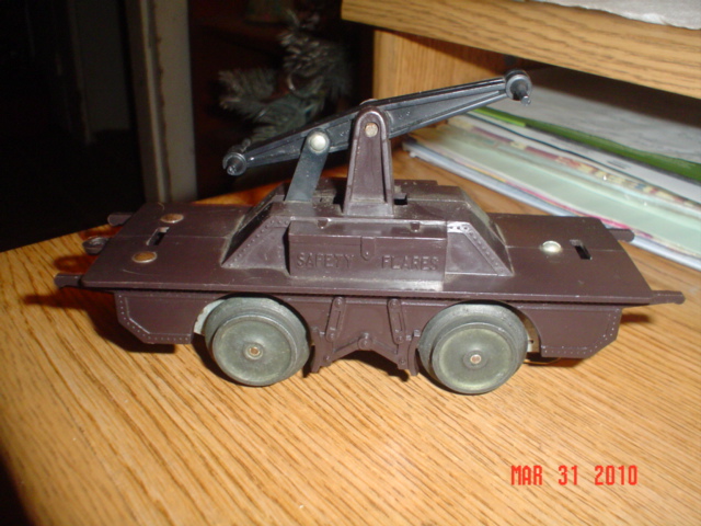 Hey folks, I picked this up with another piece I needed and don't really know much about it. It is marked Marx and it is O scale I believe. Any ideas about age or value??? I can't seem to find out anything on this thing. I'm guessing it is supposed to have a couple men on it that are missing, but other than that it seems in nice shape. BTW It runs too!!!!!