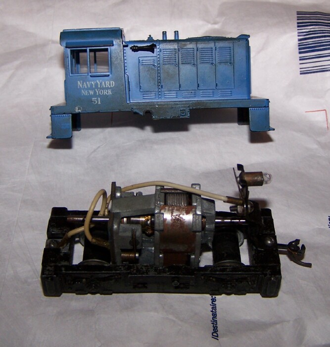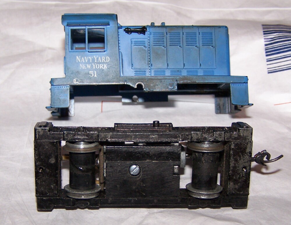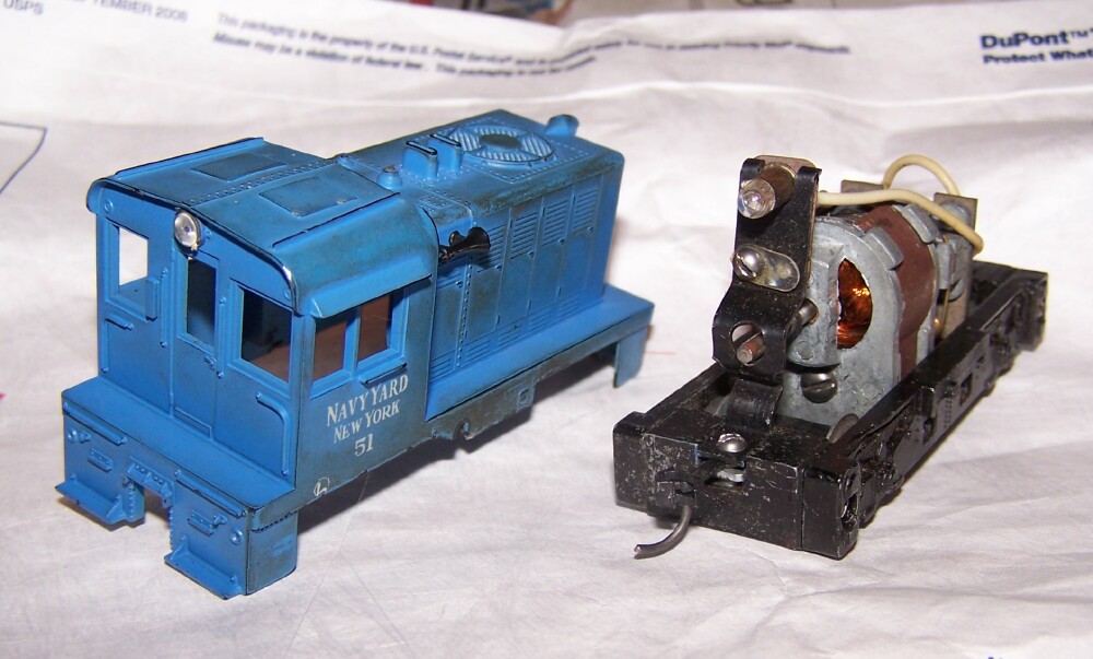 But the one I really wanted turned out to be a rubber-band drive. SHell is #51, blue, says Navy Yard on it. Haven't seen it before, came in a HO Lionel box 0570-1, I"ll have to research that. Bummed that it is not a geared Lionel Hustler, even after I asked about gears, guess the lady selling it didn't know what to look for. Not sure if I should give her a Neutral on Ebay for that or not. Definitely not a positive outcome for what I really wanted although I only paid $7 for the auction, and 7.50 shipping, and the two Mantua pieces are all metal and decent. Lionel doesn't run, either, I get a slight crackle when it's on the track, one roller is split on one side. Definitely not a happy camper at the moment. I'll take the wires loose and just power those to the motor first, see if it even runs that way.