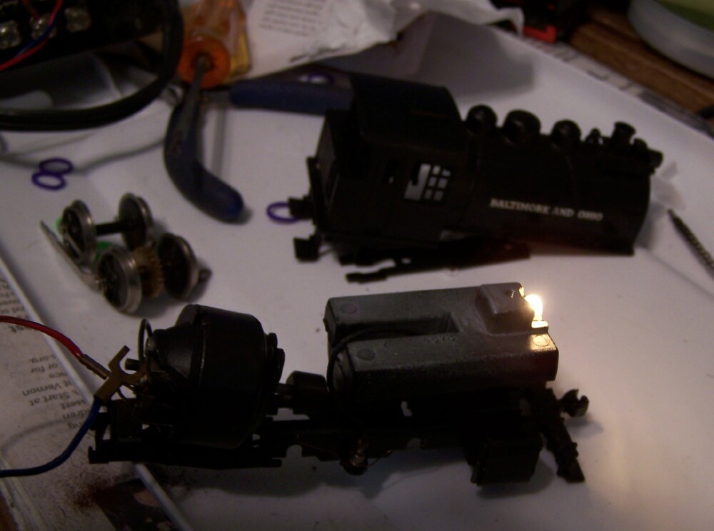 Got up this morning, let the coffee out, started the cats , waitaminute that was the OTHER way around...anyway, had some waffles, then got back on #2 . Sat down at my PC keyboard shelf to work on it. Spun the armature around with the pick tool a bit more, then hooked up a transformer to it ( he wasn't happy being woken up, either ), and lit the electrical fire....had to crank it up to 3/4 power and spin the worm gear a bit to get it to move, then it took off and ran, so I just let it go, it ran rough for 10-15 seconds then started to smooth out. Light bulb up front even still works in this one! A bit noisy, but with a drop of oil on each bearing, should probably be alright. WOrked the throttle back and forth, it seems to do ok at slower RPMs now as well. I'm rather pleased with this one, even the driving rods are nice, they were bent on the other unit, the inner ones, these are all straight. (sipping Folgers) Wow, I'm suddenly getting good at starting AND finishing projects! Amazing. I think #2 should be running the oval today without question. #1 Dockside B&O will have to await the arrival of K4's brushes i bought last night, to see if it'll also be revived. Glad it's just a cheap fix, and not requiring a whole new motor ( although that would be fun, I'm looking last night at a website that sells surplus small DC motors, I'm thinking of getting a lower RPM unit to repower some of my Hustlers and now maybe these steam engines ). ( Immediate update ) Just oiled the two bronze bearings, now it's really running smooth :