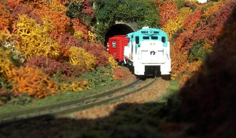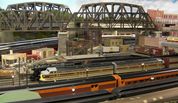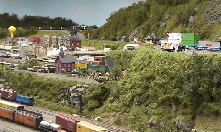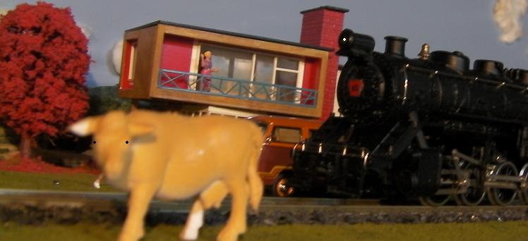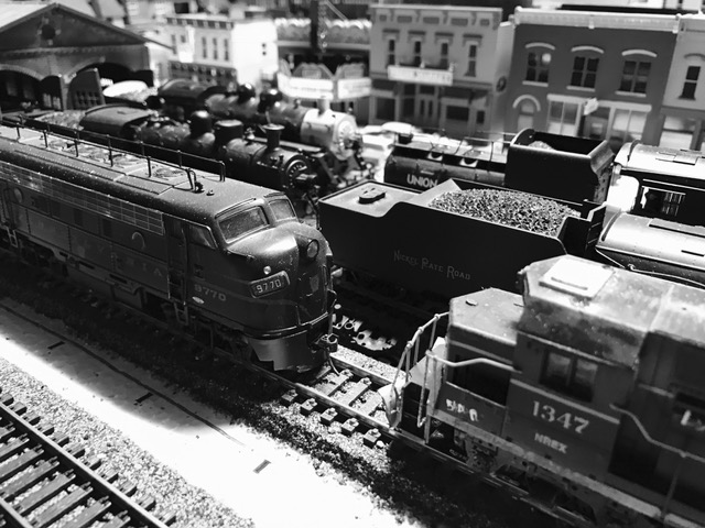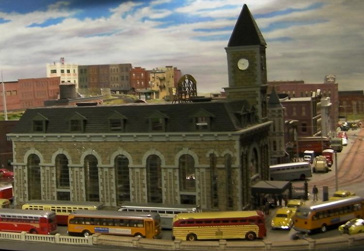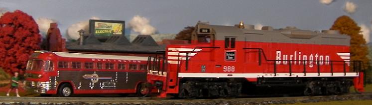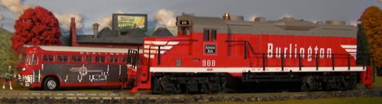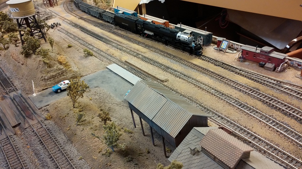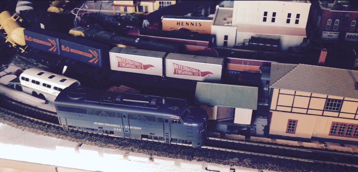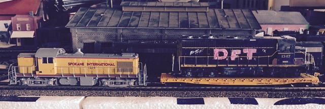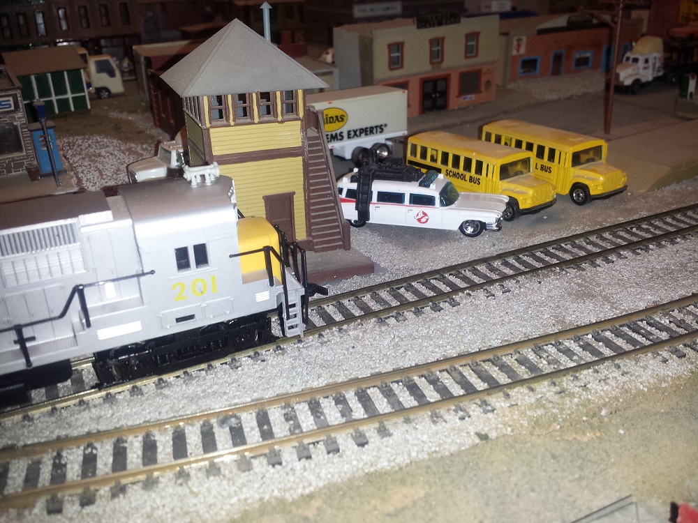 Alco, school buses, and Ghost Busters. (Layout courtesy of El Paso Model Train Club).