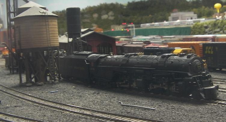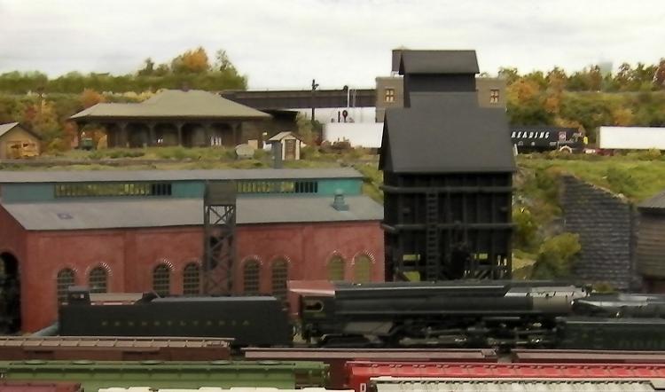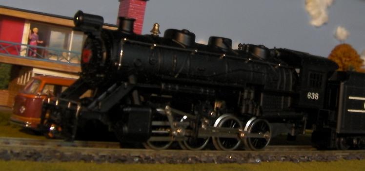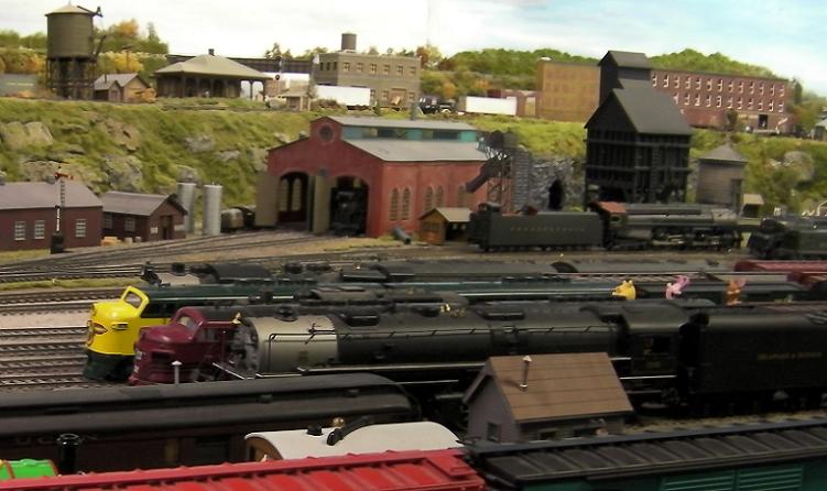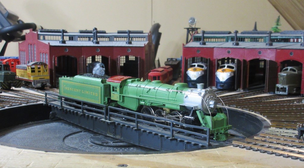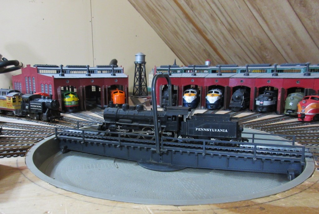 Well a tyco Southern Pacific type loco rides the turntable at the Frankford engine facility. frank