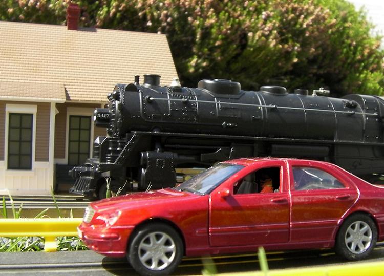 Horns blaring as she approaches a road crossing.