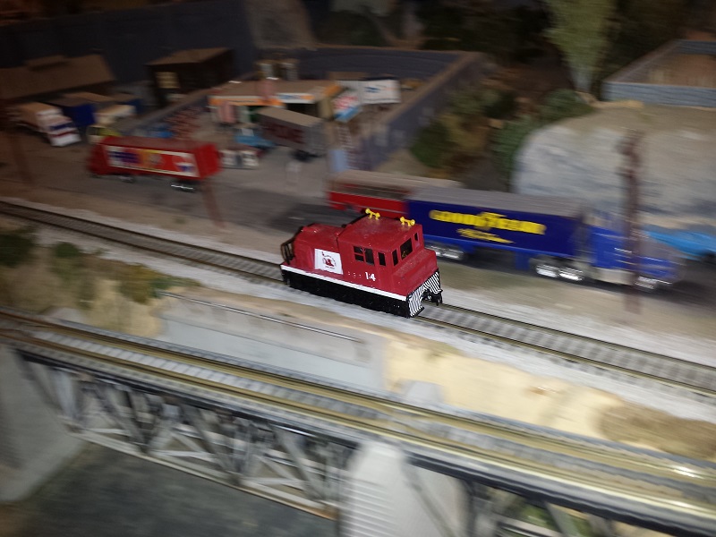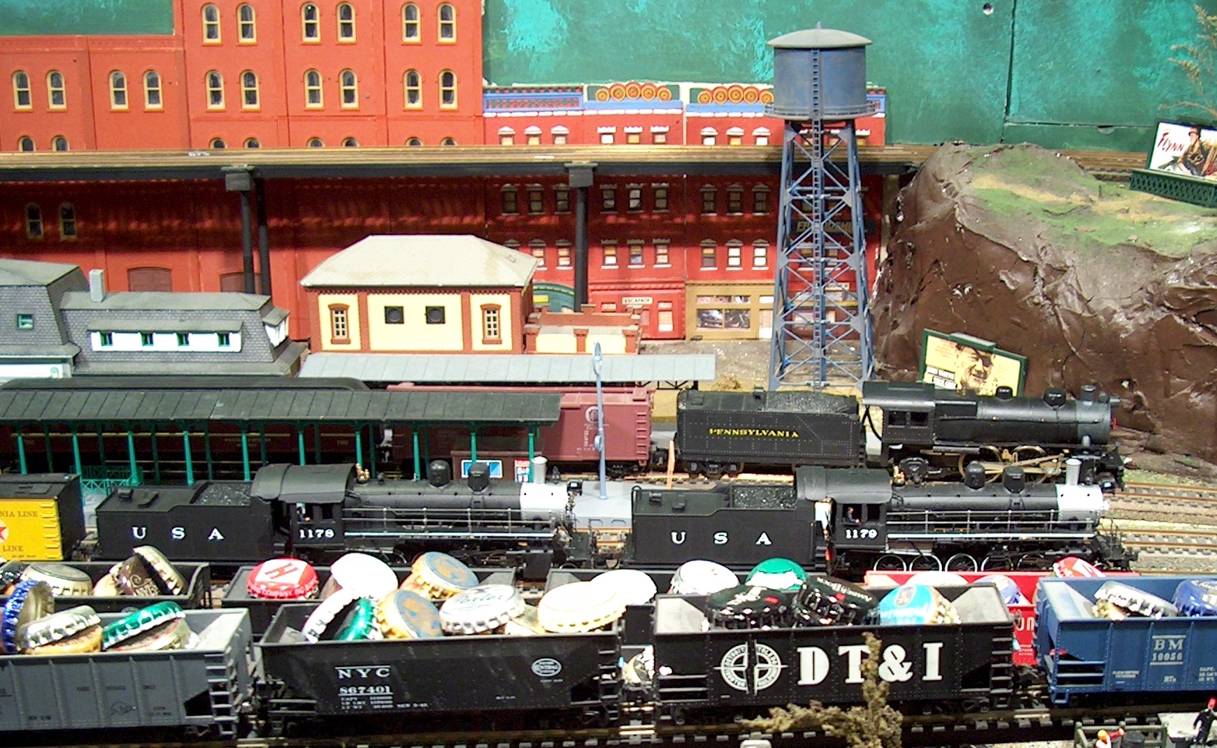Impressive Penn Central consist you saw Jeff. The CNJ helper unit was also great. Awesome steam action in Bergen Point Frank. Those oversized bottle caps show that huge amounts of brew are consumed by the Frankford crew. Next photo is of a train set with a colorful caboose departing Eustis Nebraska.