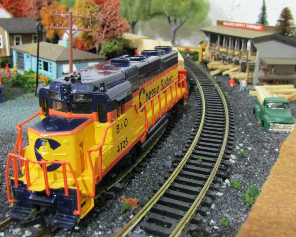 Chessie System GP-30 #4125 is spotted idling, as it delivers freshly-cut lumber from the York Sawmill & Lumber Company to the RWP Building Supplies Company.