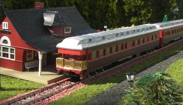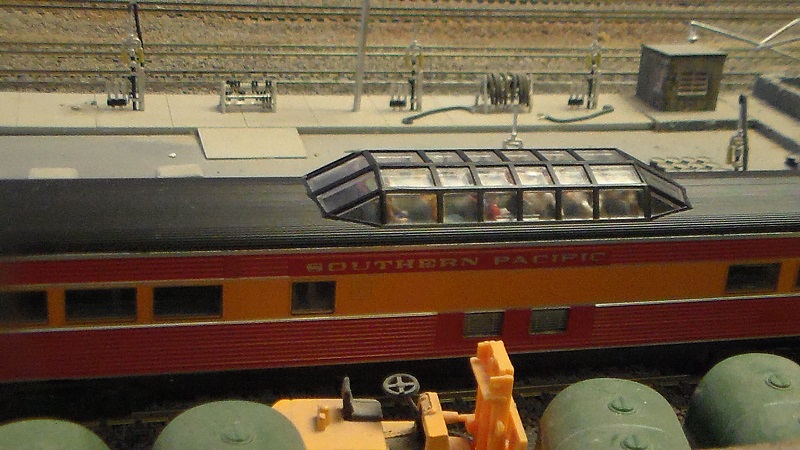 A Sunset Limited dome takes on ice and water near Union Station in El Paso. Without the AC on full blast, the passengers would quickly wilt in the torrid sun. (Photo by Chops, car by Gordon Pugh, layout by El Paso MR Club).
