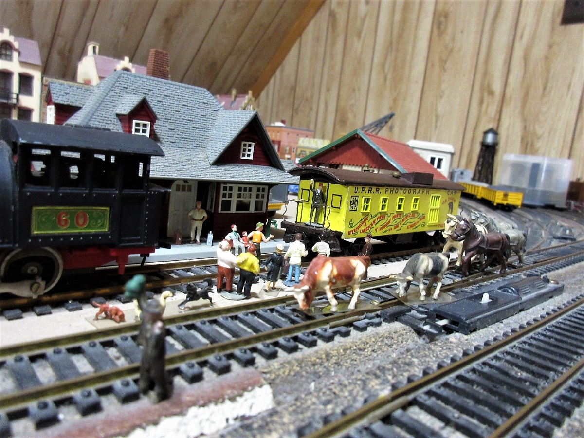 • * Snoopy has always been a well-liked man. When Benito screamed out “Come and see Me Amigo Snoopy and see the special pitcher taking car I have given to hemm.” Everyone from all around has gathered to wish Snoopy well. Even some of his equestrian friend’s “emergency locomotive teams 2 and 3” came to wish him well. The mean and nasty engineer Bad John has rolled up NYC 0-4-0t #20 to where he can blow the whistle loudly to disturb the event. Snoopy never takes his picture so he doesn’t like him. Snoopy’s others friends Burney and Benny the bulls have taken very aggressive postures and intend to back up Bad John and stop his interference with their friend Snoopy celebration. Meanwhile, Lenny, the lantern wager is signaling John to backup #20, and Gabriel the Goose wants the snip at Lenny’s leg, He is just one nasty goose! Lenny’s dogs Spot ( the larger all black dog) and Meany( the little brown yelper) chase the goose. O-My, If only Patrolman Casey were here to control this event.