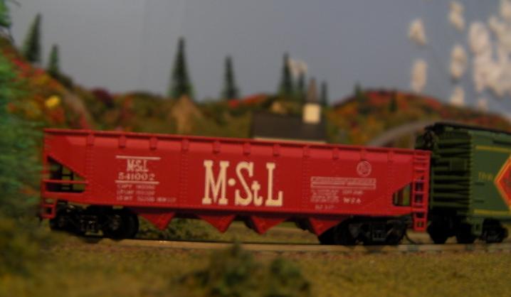 BN RF-16A Sharknose #415 hauls a small freight unit of 4 hoppers and an Auto-Loader filled with new HO cars, past the Schuylkill Valley freight Station. Luckily, those hoppers have been cleaned, or else, the auto dealership would have some coal-dirty yet new autos on their hands.