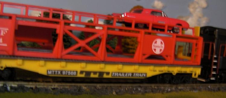 Union Pacific F7 #537 wearily stops in front of Nazareth Crossing, with a load of piggyback cars behind it, all bound to be returned to the truck terminal.
