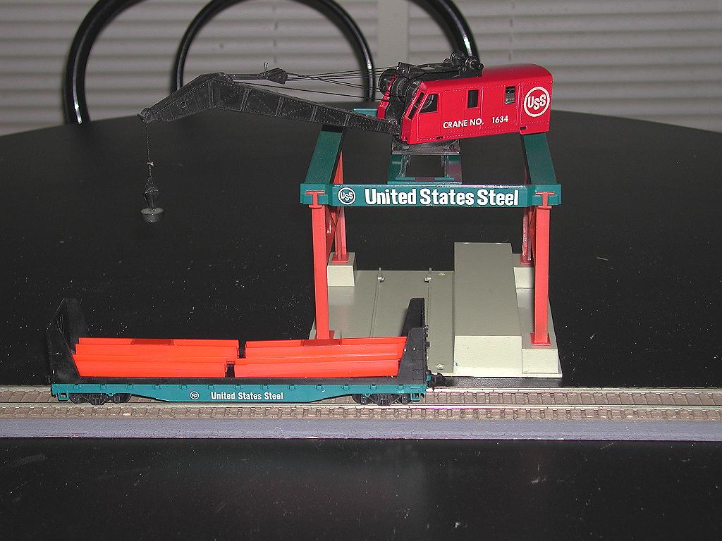Picked this up at the Flea Market at the Show I just did Sunday. The Guy had the USS Flatcar on a table with some other cars. I asked How much since 2 wheel sets were missing. He said $1 Then I asked if he had the Crane assembly..?? He pointed to a Plastic Trash Bag filled with Buildings.. So I looked inside and I found the Base and crane... It was Filthy. So I asked How much..?? He said $2 So After Disassembling and much Cleaning of all the Items this the finished Item. Not Bad for $3 Too Bad We do not make Steel anymore... Carl