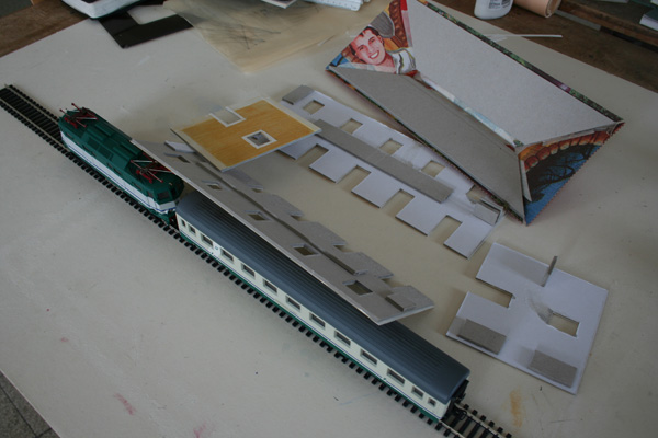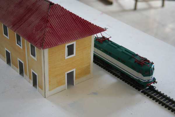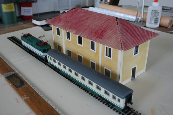 I decided to build a model of a medium sized Italian train station (similar to the one in the town our study center is in) this week. I found the plans in an old Italian model train magazine I bought at the monthly antique fair in the town to the north of here. Not having my supplies of model-building materials like I would back home, I started the project using the cardboard backing of my used-up watercolor paper pads. I used strips of watercolor paper for the trim, and pizza-box cardboard for the roof. Talk about getting back to the early scratchbuilding days of the hobby!