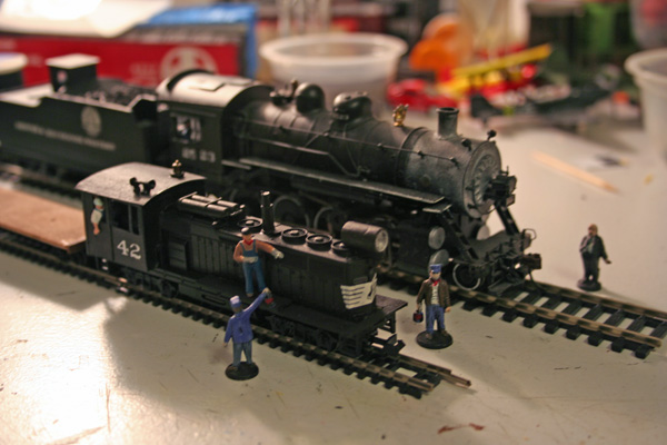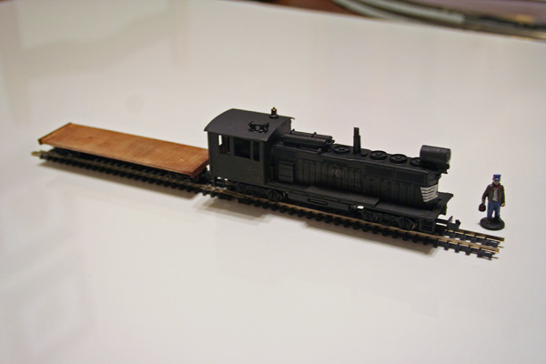 Painted, with a flatcar built on a boxcar chassis in tow (the exhaust stack is a Battleship game peg):
