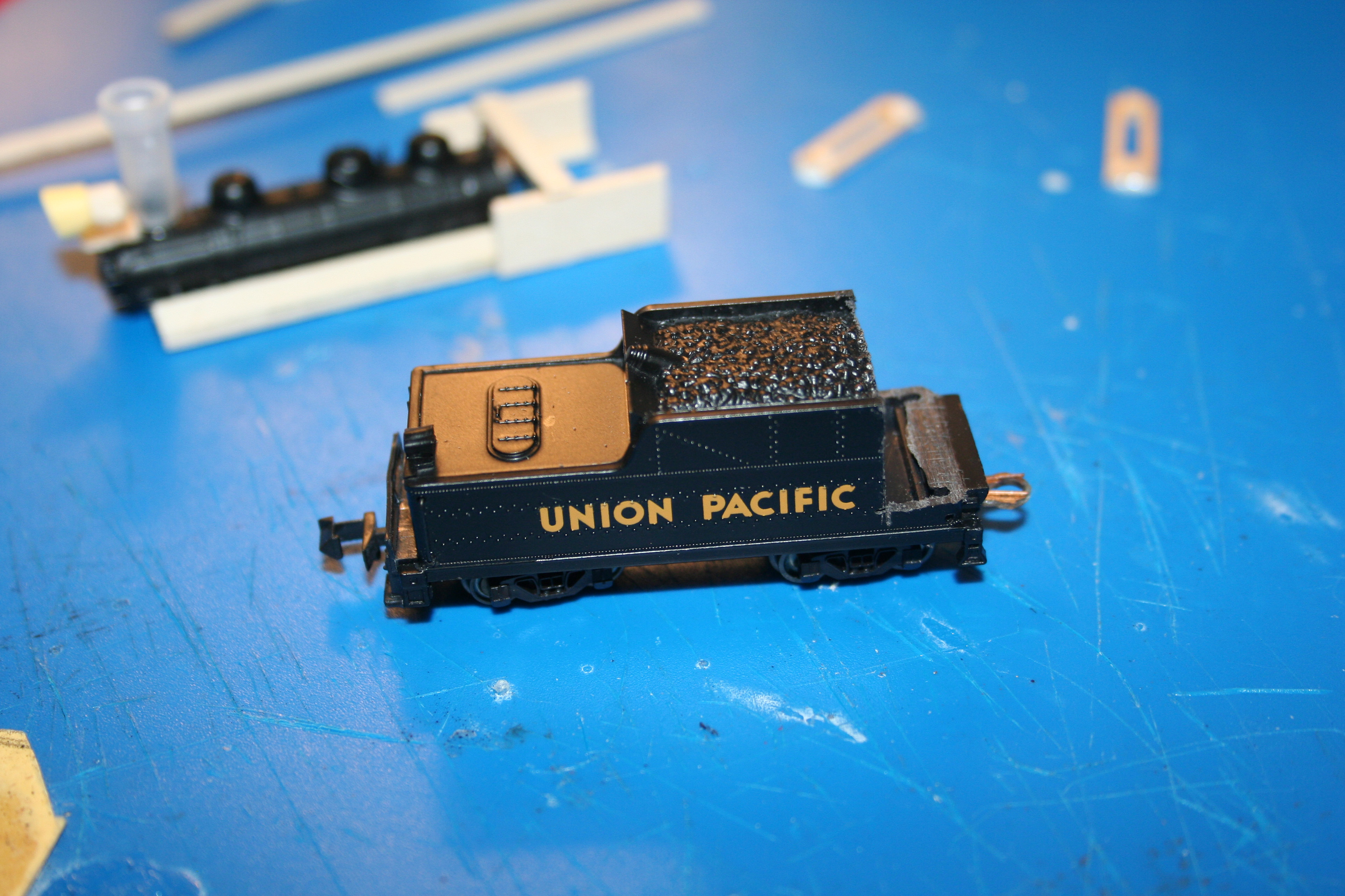 I'm running out to Hobby Lobby today (only "hobby" store where I live) and grabbing a few more N-scale cars to cut up...I'll post some more pics of the rolling stock after I get a caboose built.