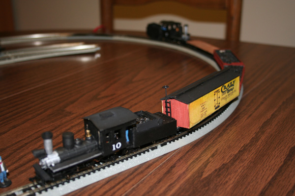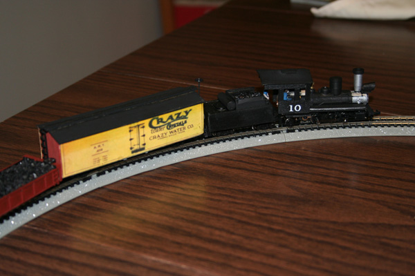Here it is with the just-completed "Crazy Crystals" boxcar I scratchbuilt using Micro-Trains trucks: