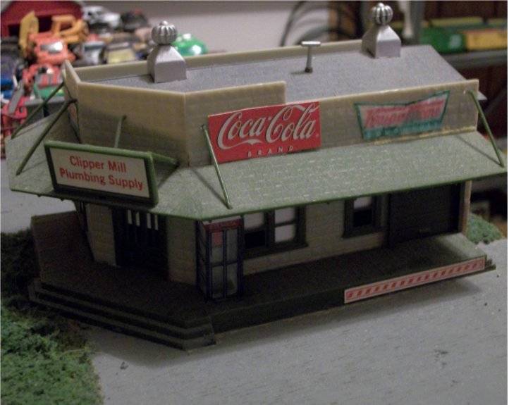 I have had this building for what seems like forever. You can tell by the cut out signs I did years and years ago. Now that I am able to do my own decals, This building will become a diner. I added the window shades and phone booth a while back. This building could be home to just about any type of business. Thank goodness mine did not come painted like yours LOL!