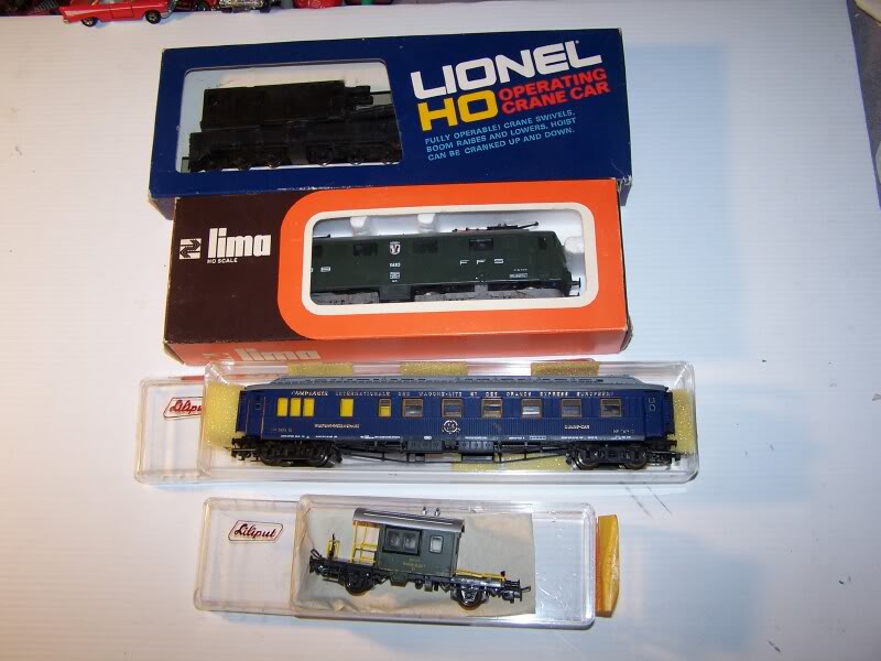 These are my late teen year acquisitions, as I started getting more sophisticated and interested in more complex railroad cars. The Lillliput cars and Lima engine I BELIEVE I bought in Switzerland or Germany, I went over in '78 on an Easter vacation school class trip, and had several hundred in spending money ( from my lawn cutting empire ), so I bought a pantograph-equipped Swiss? Loco, a French passenger car, and a MOW? caboose. I think this was my very first Passenger car I ever bought. Definitely the first pantograph locomotive I had, since I never saw any in the USA ( although I live in the same state as the Virginian railroad, which had E33's with electric pantographs).