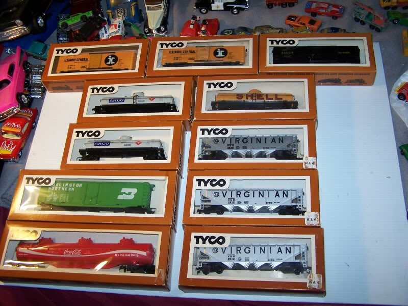 These are all my Tyco brown box cars I bought as a young boy. Some have K & K, Woolco, and other price stickers on them, around 99 cents or $1.29 on sale. I found out I have the Coke long tanker,didn't remember that one at all. I remember buying the Virginian coal cars, the Arco tankers, and for some reason the Illinois Central cars because I liked the design and color.