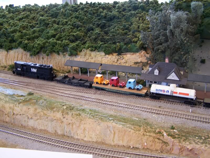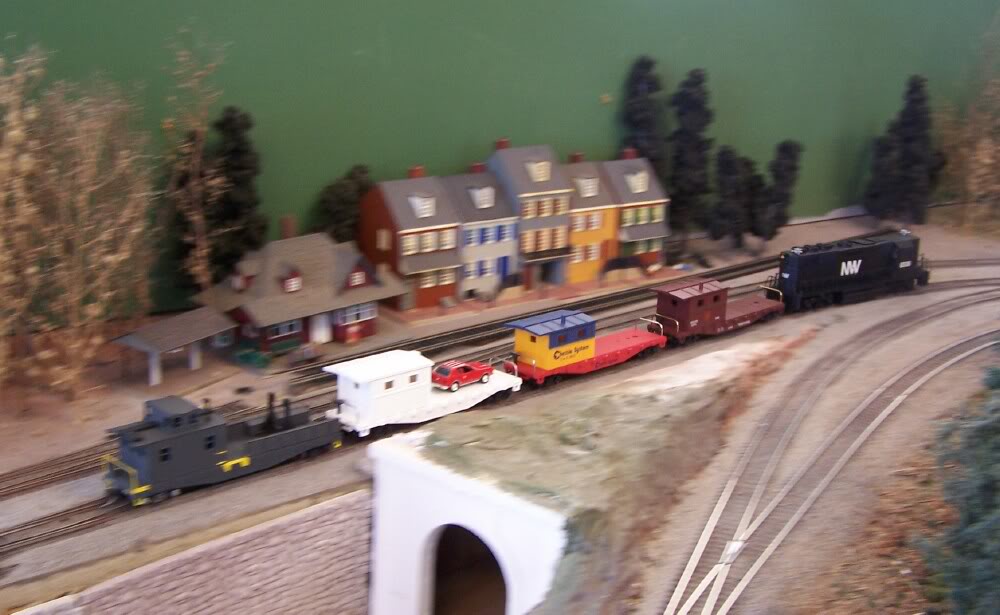 I took the Union 76 and 3-truck flat car with me to my club's Open House today, and ran them behind a Bachmann NW engine. I also made some interface cars, with one horn-hook and one Kadee coupler, so I could interface with the Tyco's without redoing their couplers. Both the tanker and the flat car with load did swell, minimal shaking, I just need to add weight to them now. But there was no major wobbling running around the layout at all. Even the club members commented on that when I told them they were Tyco's which I'd added some stabilization to them, and were impressed. Only problem I had was a switch point, the little piece that hangs down was catching on one particular switch, so I cut it off about 1/16th of an inch, and then it cleared ok. Here's a shot of them on the move :