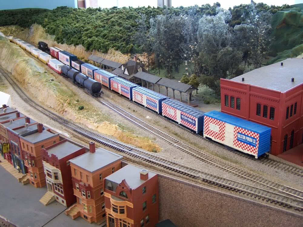 My last consist was a Purina special Pet train, mostly Tyco but some other makes as well. I didn't convert these yet with wavy washers, I just ran them with stock horn-hooks, and they did fine. The classy track cleaner on the end was a hit, I could tell where my train was at all times without even looking, and people could hear me comin' ! It has beads? in the center wheel, so it kinda sounds like a railroad Maraca. LOL. Had no derails or much swaying with the Purina cars, I was impressed. :