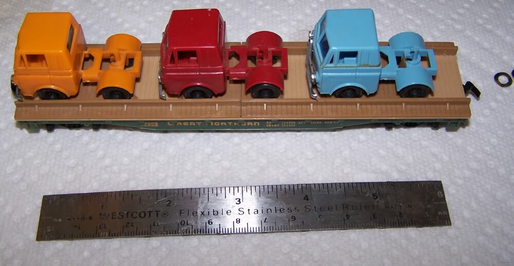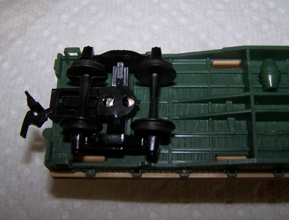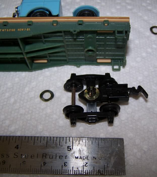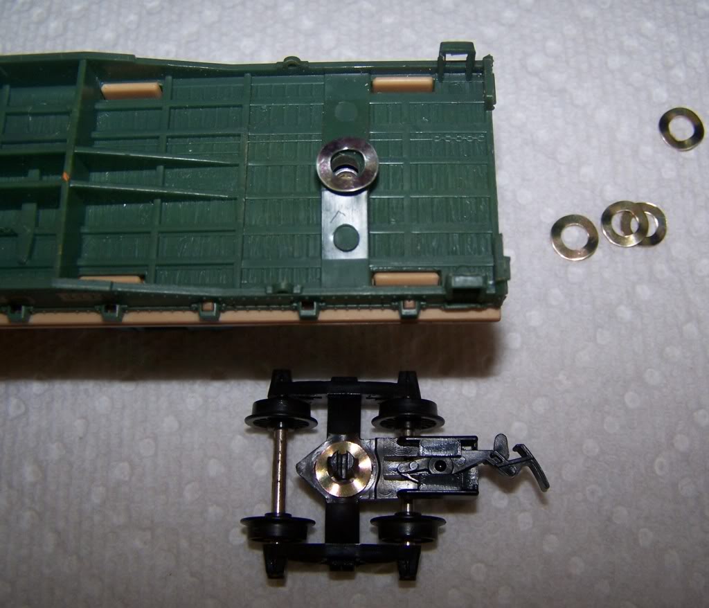 The only glitch seemed to be the Athearn oops Lima flatcar I tried, the trucks have two raised sidewalls, so the washer won't fit between them. Guess they could be cut off, but I'm loathe to do that to original equipment. I think they're supposed to prevent the truck from wobbling, but since they're too far from the push-pin to contact it, they're useless for the most part. But they worked WONDERS on the Lifelike and Tyco cars I tried, I'll see if they work on Bachmann, Marx, Athearn and others later on.
