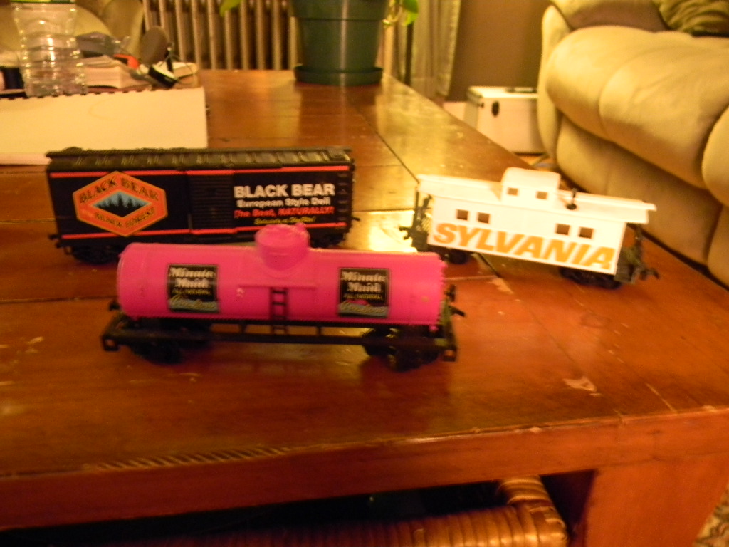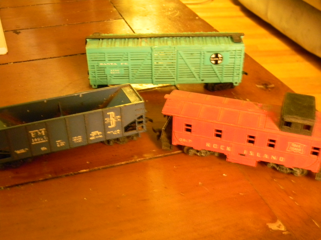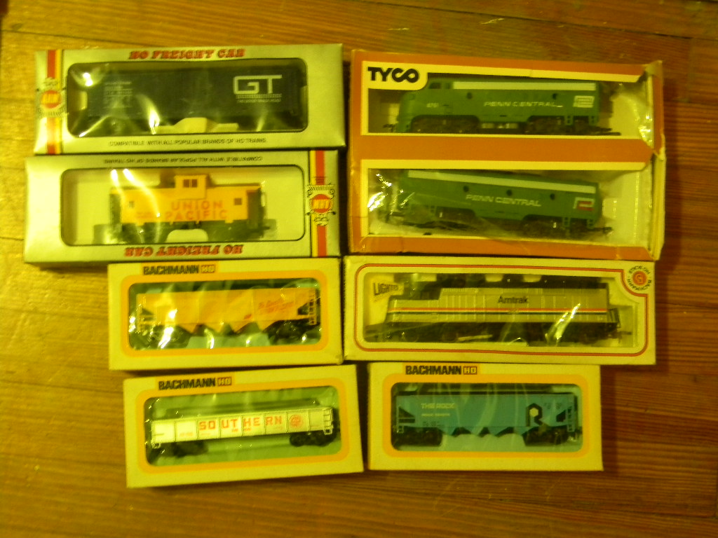 I see 5 I want  Sylvania caboose Tyco cattle car & depot set Tyco fllodlight car Rock Island caboose Maybe the PC loco & dummy set  but nice collection