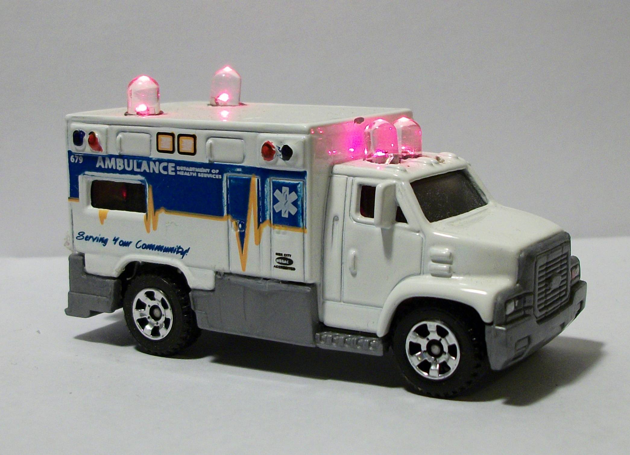 The Matchbox ambulance in the open door has working emergency lights that I customized into it. They are bubble lights not barlights and each led flashes red and blue. It's not the best job, but they sure do light up well. Is there a way to put a video in the post without puting it on Youtube?