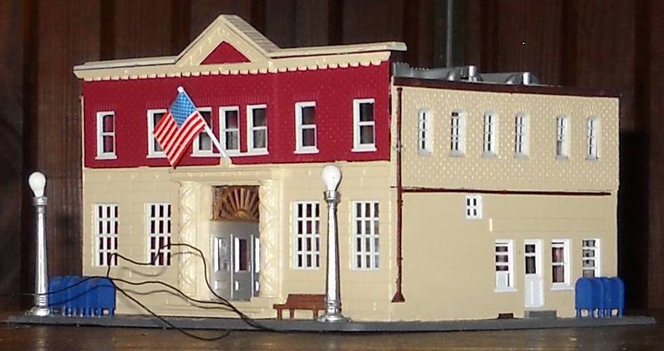 This Post Office started with the Life-Like Business Center kit which is their same kit as the Police Station. Sprayed the walls beige and added some color around the front doors. Tyco mail boxes on front & side, a pair of working LL light ups poles with the flag flying on the front. Will add more detail if I use this on my layout...