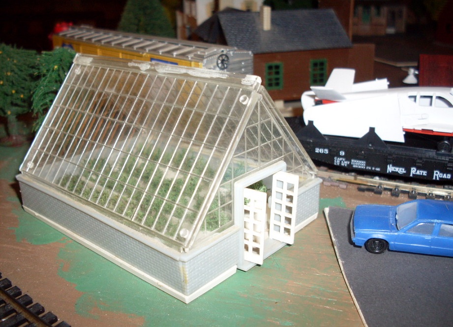 Here's something a little different. It's a Plasticville greenhouse. I got it in last week's garage sale lot. There are boxes inside with little pieces of lichen to simulate the plants.
