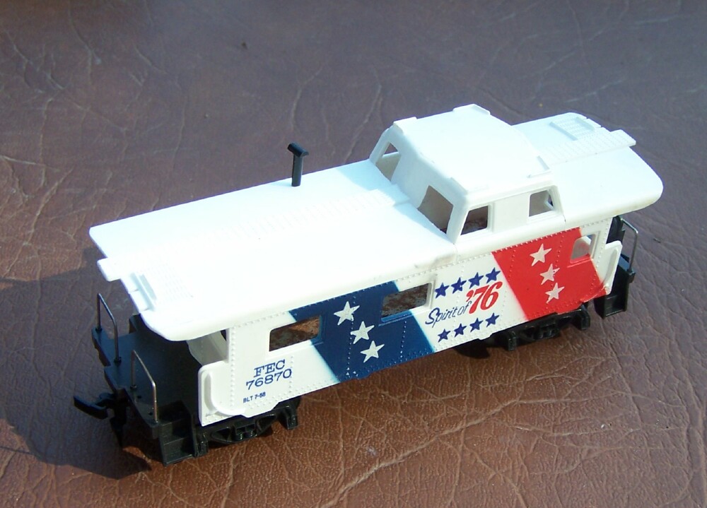 My car o' th' week is my new Blue stripe forward Bicentennial caboose, just got it today at the train show. A Vendor had a whole box of the boxcars and cabooses, about 4 sets of 4 cars each, the cabooses he wanted $4 for. I looked at all 4 he had, and one was the reverse stripe, so I picked it, and he didn't know the difference. The Minutemen boxcars were all the later ones with modified artwork, nothing to get excited about there. He had the Revere car and the GW Crossing boxcar. Didn't have any engines that I saw, though. Still, 4 sets in one place, all reasonably priced, not bad.