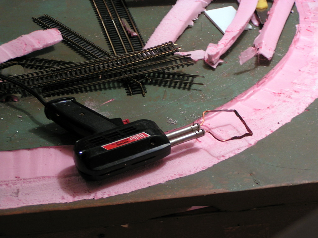 Second, I wanted a canyon so I cut out one---note my home made foam cutter. One of my long box cars scraped the canyon side, easy piece of surgery to correct
